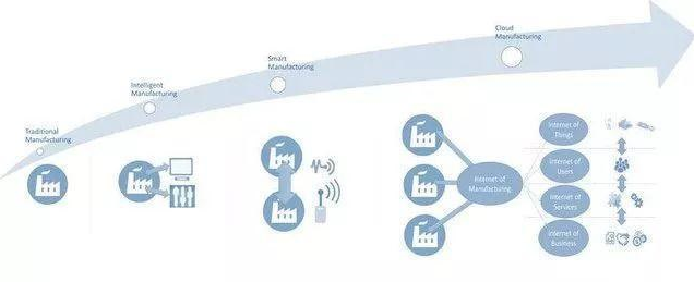 圖片展示了云制造的概念,以及從傳統(tǒng)制造,到智能制造,到智慧制造,到今天的云制造的過程。